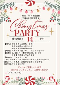 日時 12月14日(日)11:30~(受付11:00~) 場所 博多エクセル東急 2階 会費 5,000円(体験参加6,000円) ※お食事つき 服装 男性・スーツ 女性・お出かけの装い 筆記具をご持参ください 申し込み締め切り 12月11日 ※これ以降のキャンセルの場合、会費はお支払いいただきます